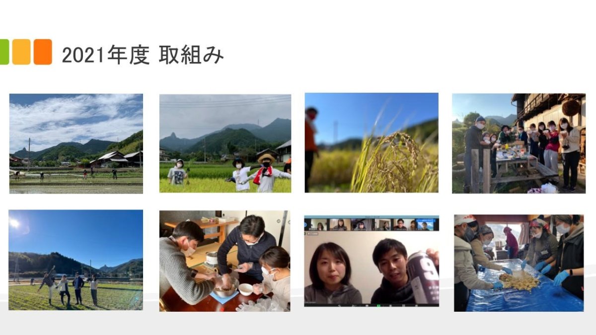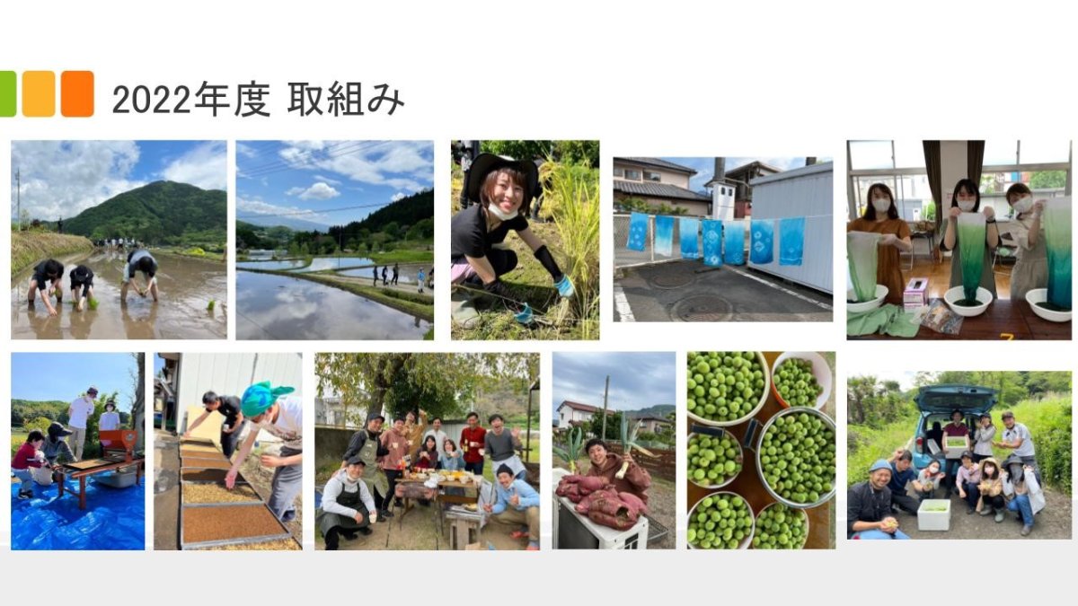 2022年度では、農家民宿ひなたからのご縁で出会った富岡市吉田の「吉田地区地域づくり協議会」の協力のもと、地域の耕作放棄地をお借りして念願の農園を持ち、野菜づくりに挑戦。毎週当番で作業に行き、多種多様な作物を、嬉しいことに毎回豊作の収穫ができています。 さらに、「農家民宿ひなた」とのつながりで東京のラーメン部と一緒に活動したり、藤岡市鬼石「ゲストハウスさんと宿」で収穫祭を開催したり、沼田市薄根「薄根地域ふるさと創生協議会」の稲作オーナーで棚田で米作りをしたり、と地域を広げて様々な人に出会い、活動することができました。